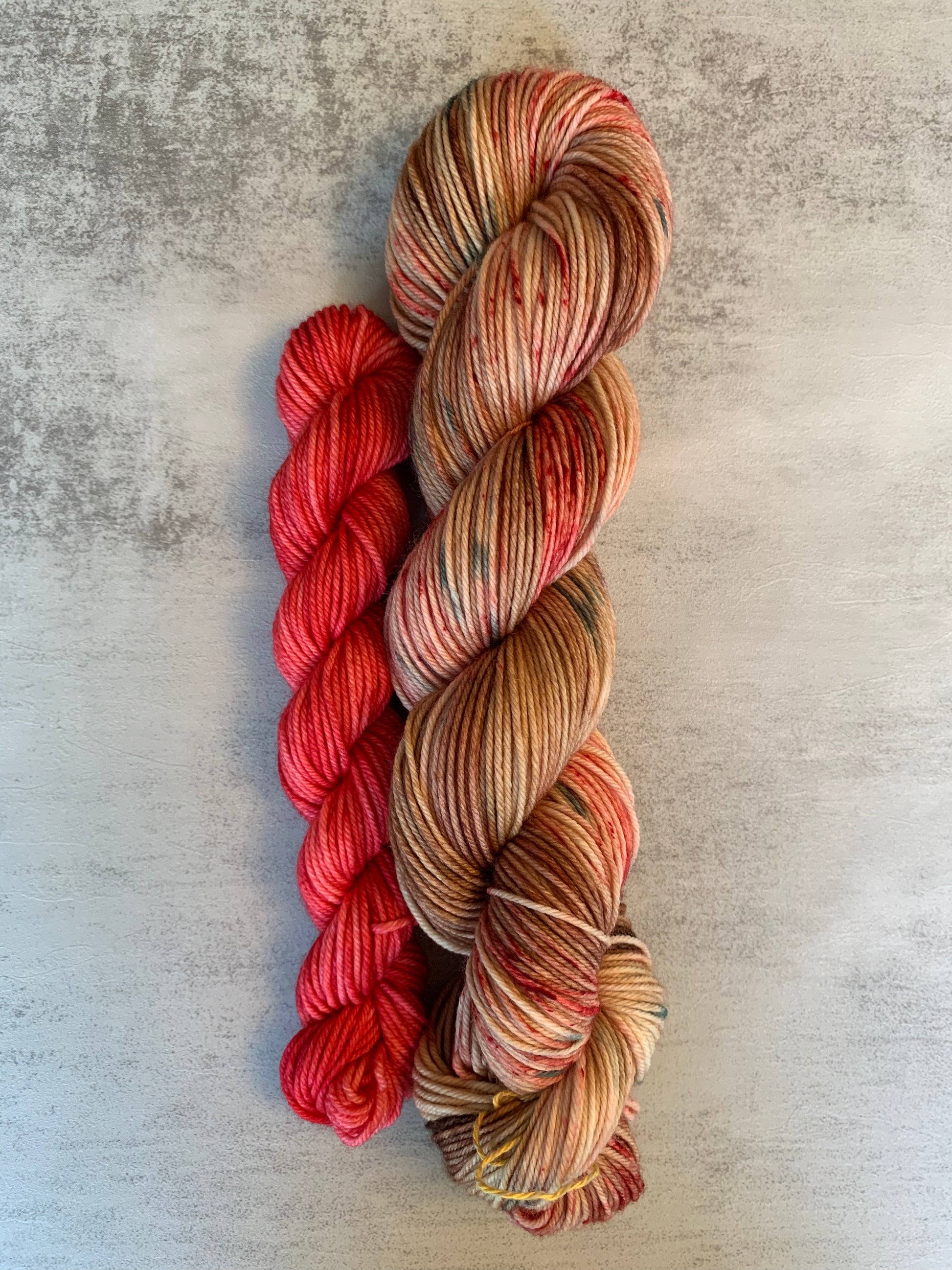 This sock set is available in either our Superstar (fingering weight) base or our DK base. The yarn will be dyed to order; please allow 1-2 weeks for your order to ship.